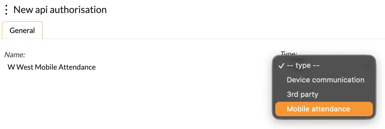 To create a new API, give your API a name and under Type drop down menu select “mobile attendance” and your work here is done.