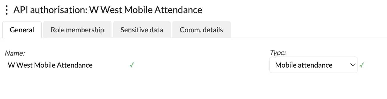 Role Membership | Shows the roles that the API has been assigned. For mobile attendance the roles currently allocated are; devices, employees and attendance. Clients will never have to tick these options as the API assigns these roles. |