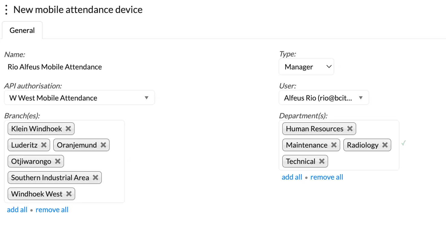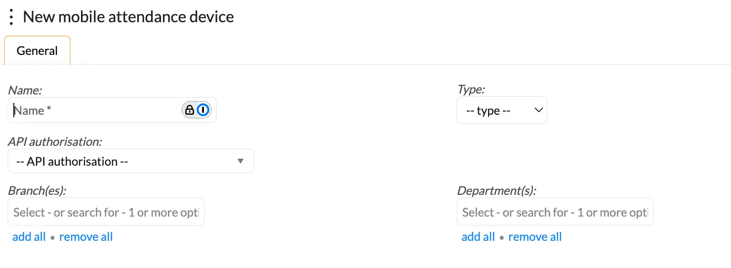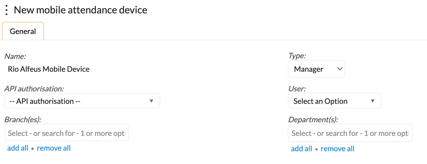 The below window will open. Give your device a name, select the type "Self service", link your created API and the required branches and departments for the employees who will be using the self service clocking platform.