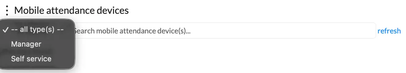 Navigate to the Mobile attendance devices menu in BC Time. Once in the menu, click the vertical meatballs to access the below window to create a new self service device.