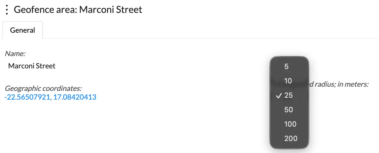 Once selected, the below window will appear, with the option to select and link the Geofence area (Marconi Street) that was initially created.