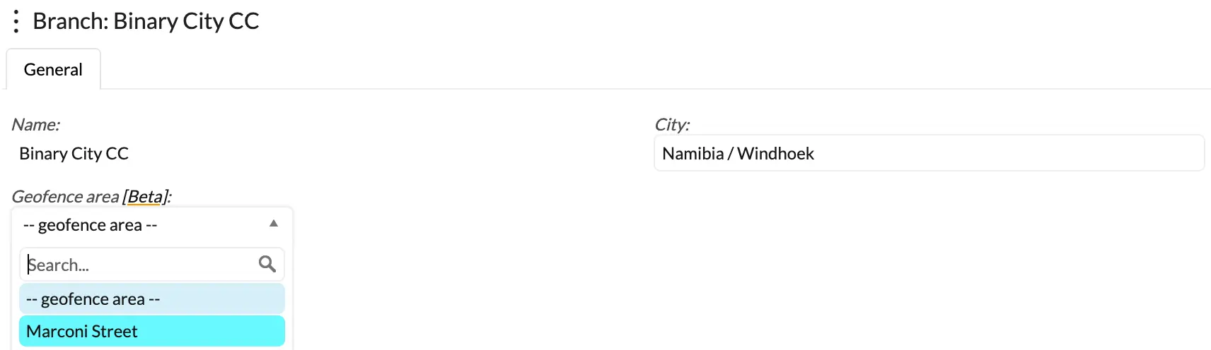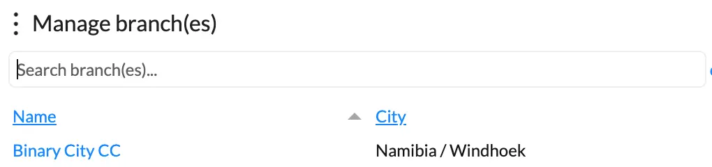 In the Manage branch(es) view, select the branch to which your would like to link your geofence area. In our example below, we will click on Binary City CC as the branch we want to geofence.