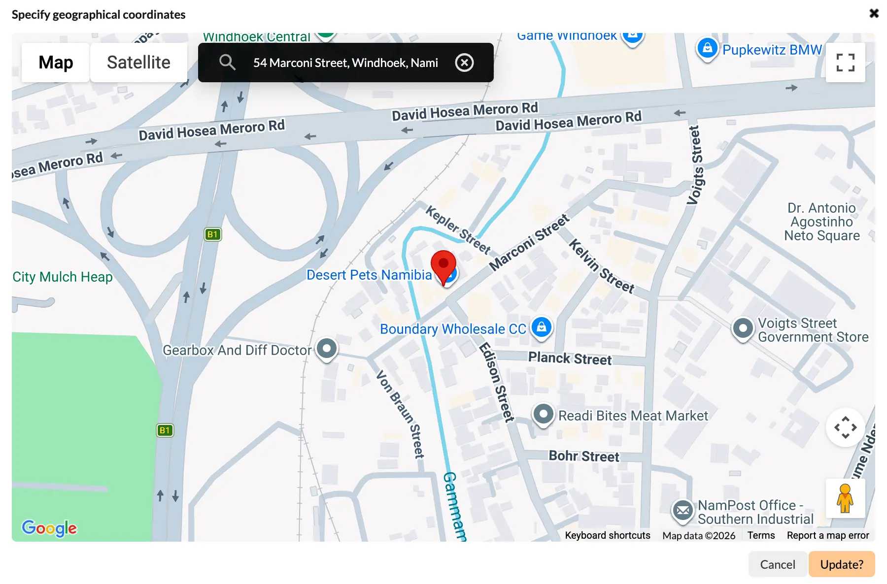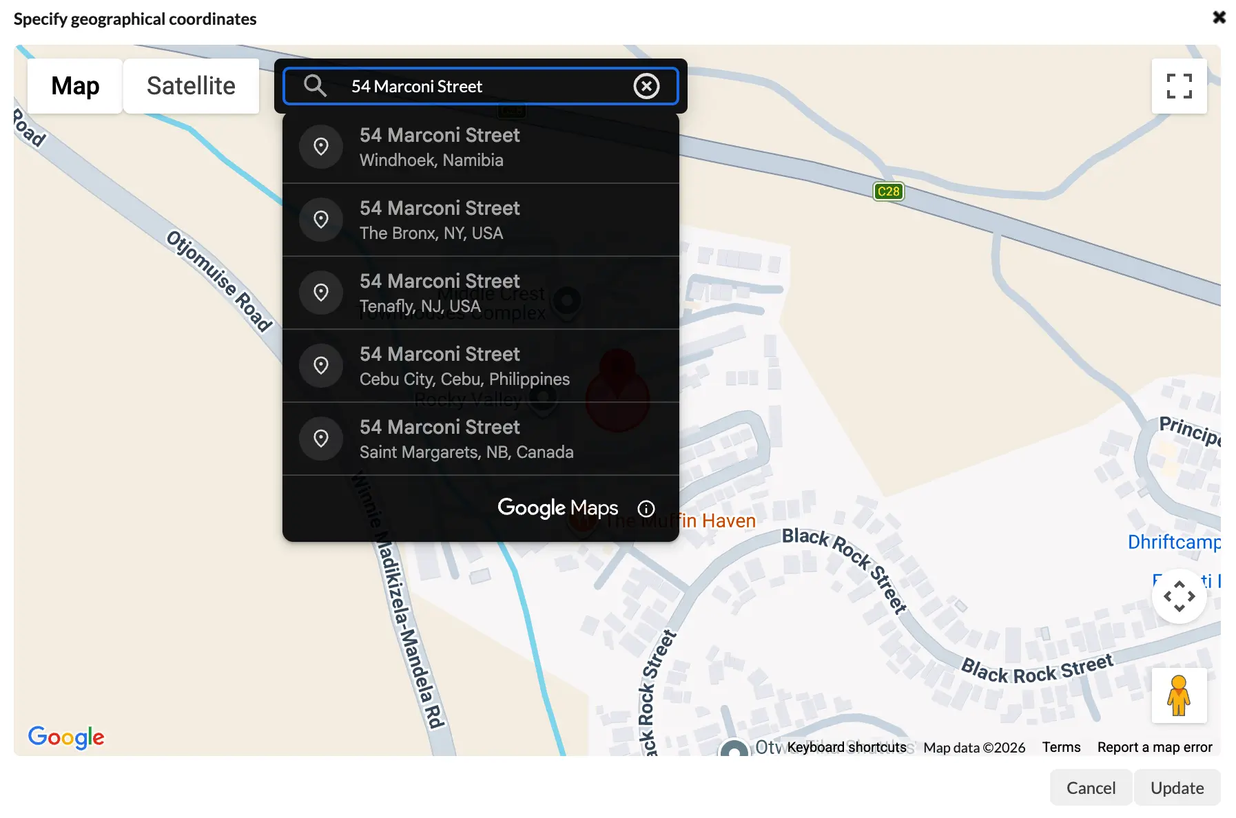 Once you’ve given your area a name and clicked on “set geographic coordinates” — a map will appear and you’ll be able to search your desired location. In our example below, we want to set “54 Marconi Street” as our coordinates.